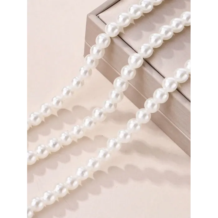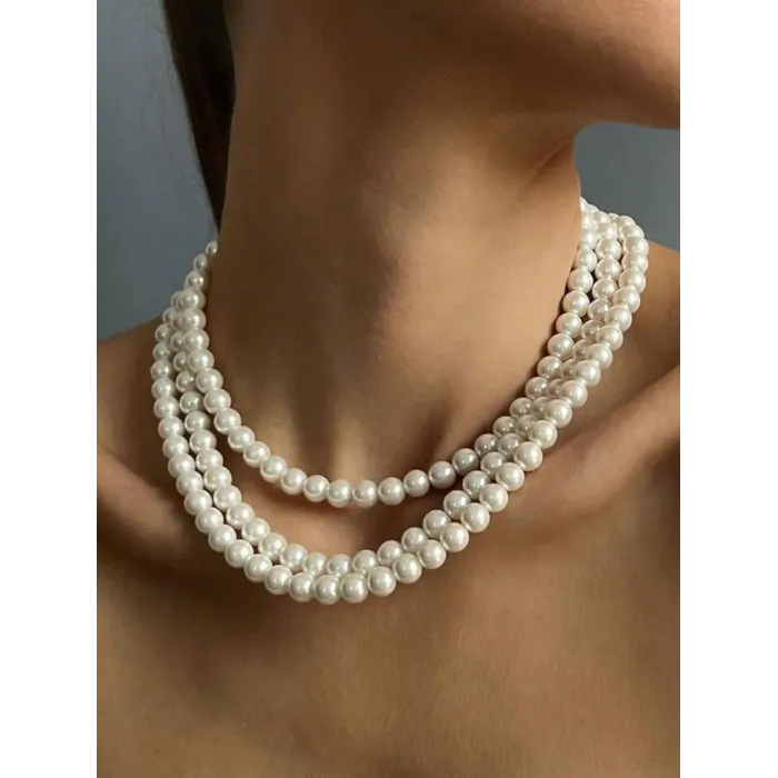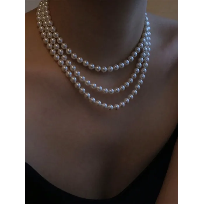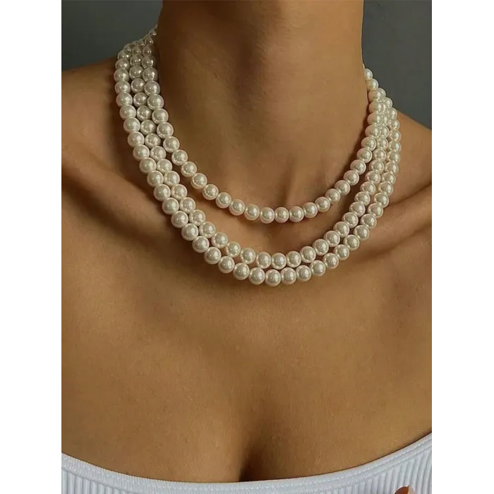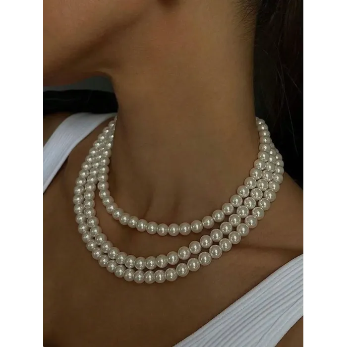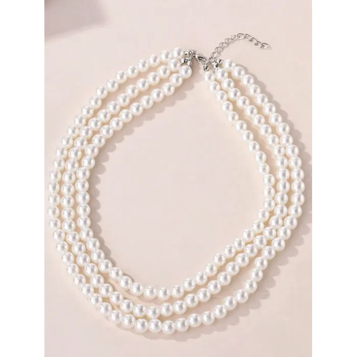 3-Strand Faux Pearl Layered Necklace for Women, Silver-Tone Clasp