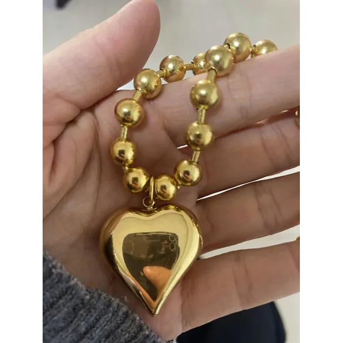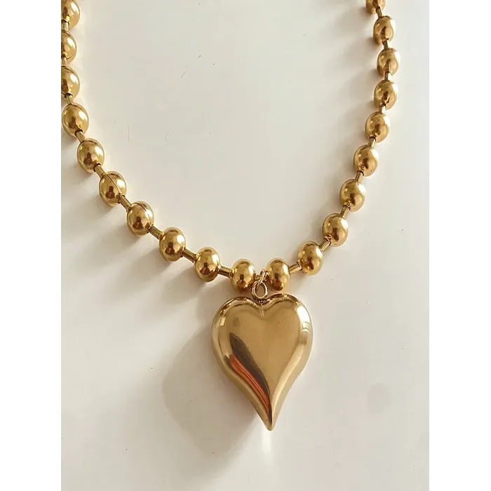 Gold-Tone Beaded Chain Necklace with Polished Heart Pendant for Women