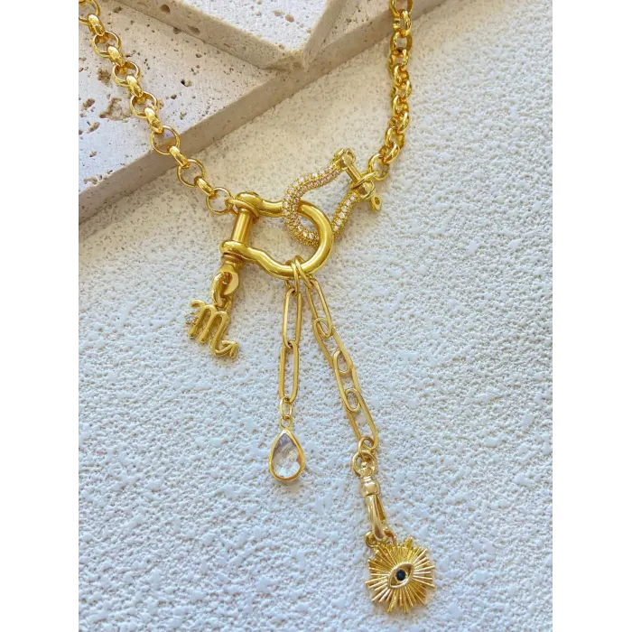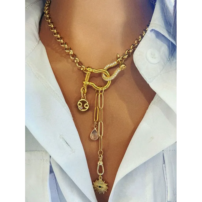 Gold-Tone Layered Chain Necklace with Crystal-Embellished Clasp, Zodiac Symbol & Sunburst Eye Charm
