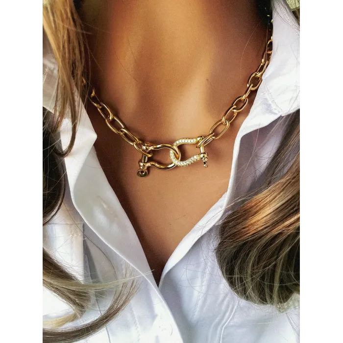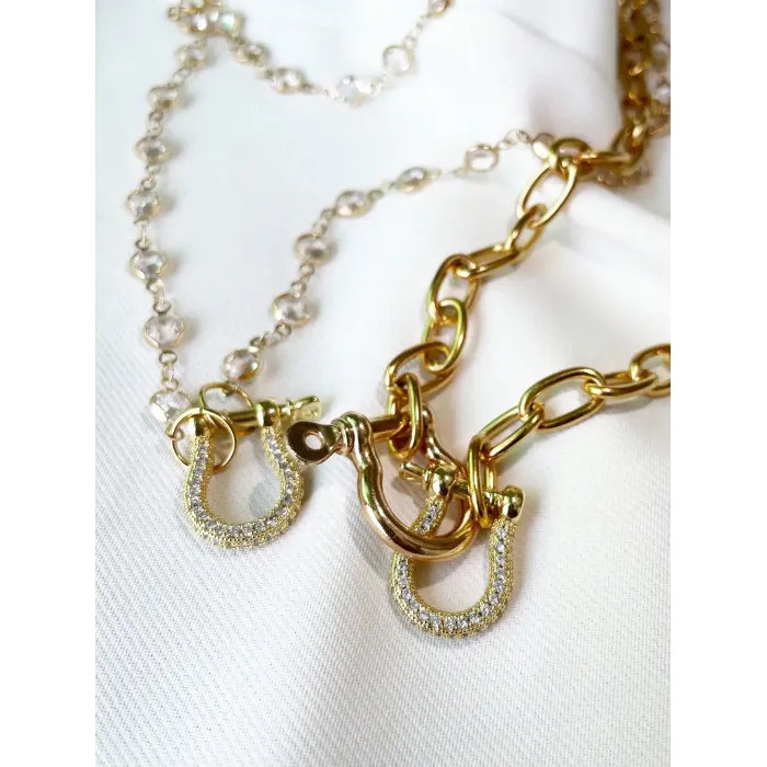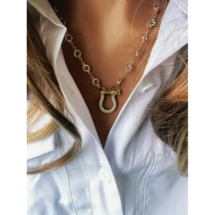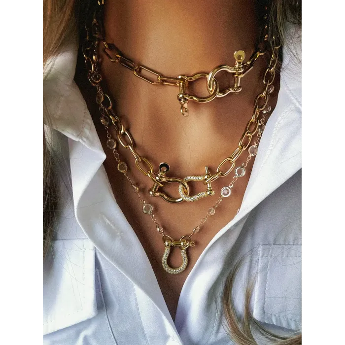 Layered Gold-Tone Chain Necklace with Crystal-Embellished Shackle Pendant