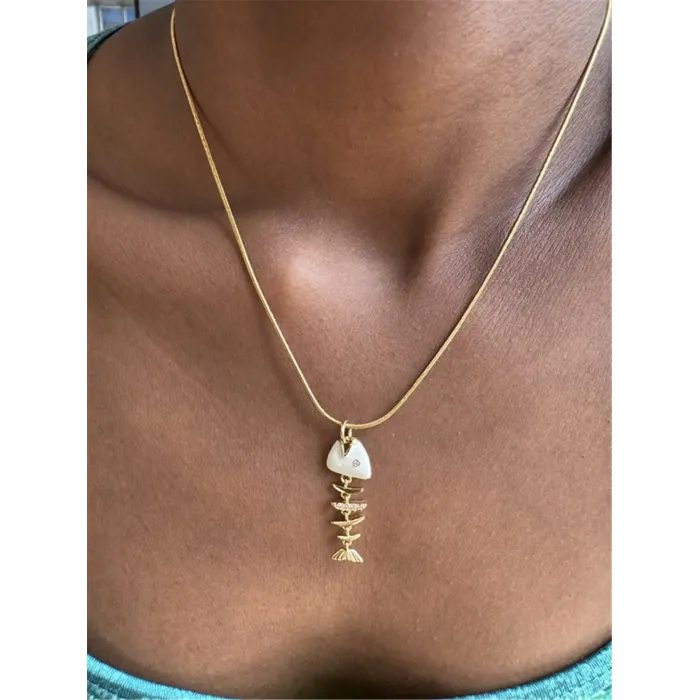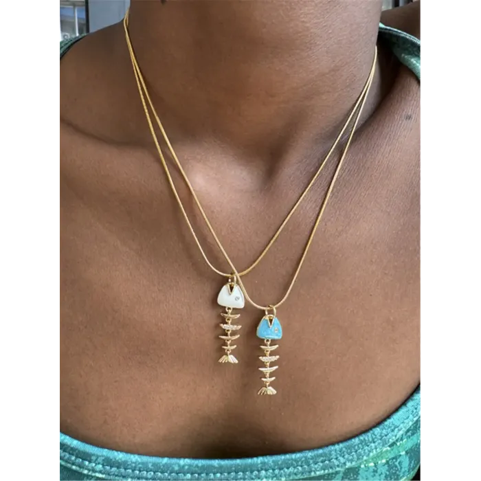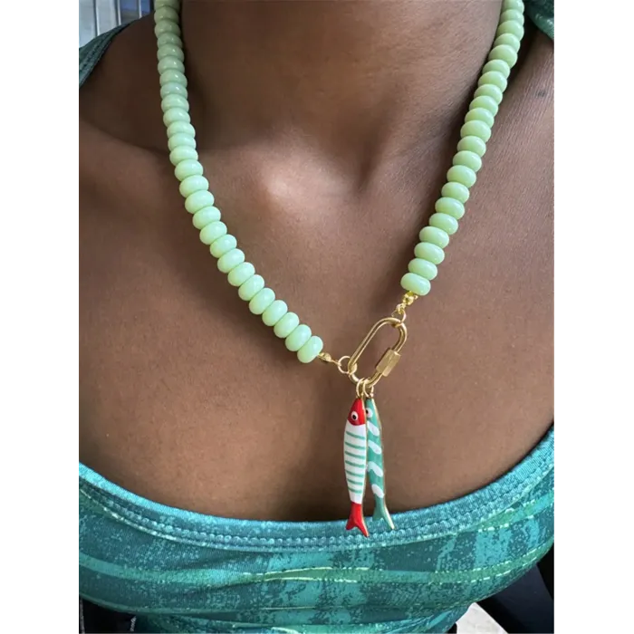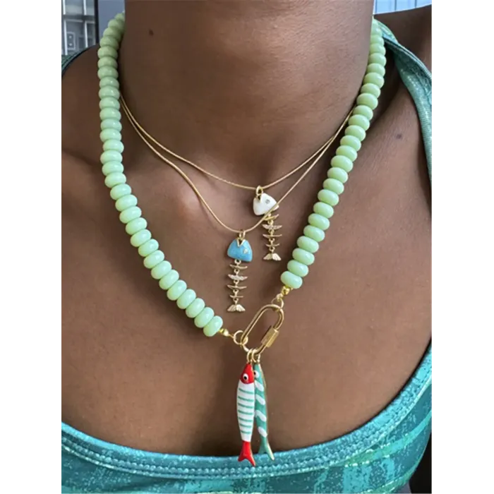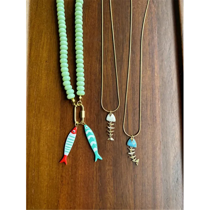 Mint Beaded Layered Necklace with Enamel Fish & Bone Charms, Gold-Tone Multi-Pendant Design