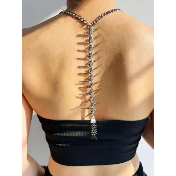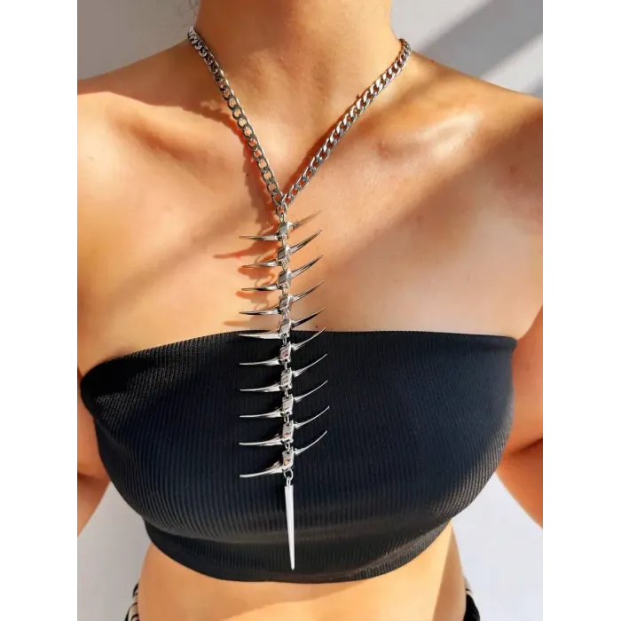 Silver Spike Spine Chain Back Necklace for Punk Streetwear Outfit