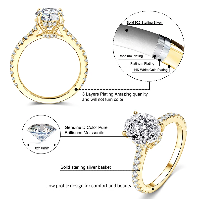 IOGOU 8x10mm 3CT D Oval Moissanite Diamond Rings Classic 925 Silver Engagement Wedding Ring for Women GRA Certified Fine Jewelry